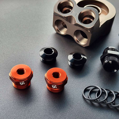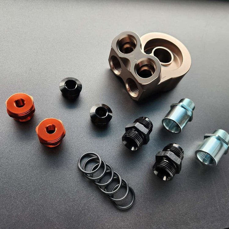 Once only sold as a custom set up, we have finally normalized and refined the specs on our oil Sandwich plate adapter. From high quality AN fittings to track tested and proven hoses and cooler, we have decided on this impeccable formula as our offering. Carefully crafted and quality machined oil sandwich block and hose fittings make this a leak proof setup. Don't compare this adapter to lesser priced counterparts, it's not in the same league!