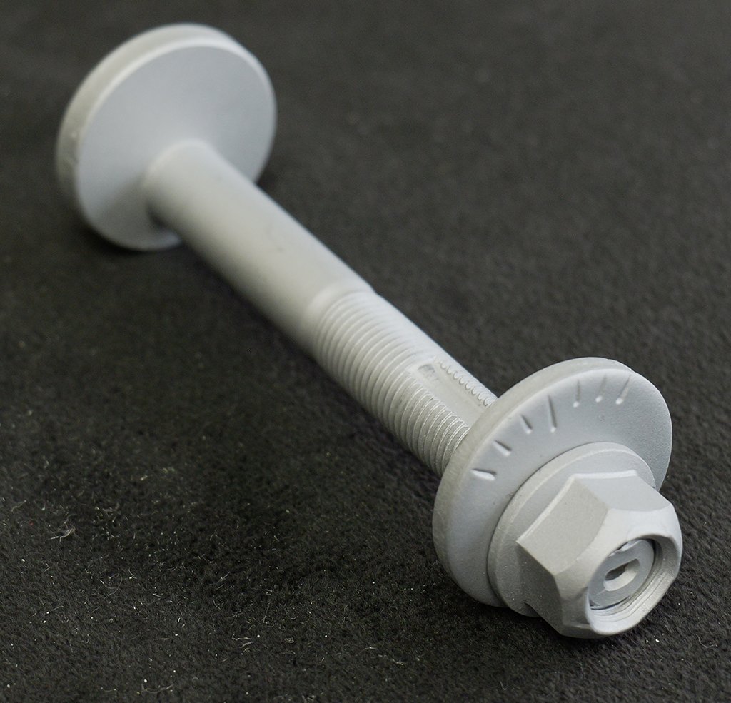 Our latest alignment bolts are grade 12.9 with a max torque spec of 149Nm. If using them on a street-only car, OEM torque specs can be used. Our bolts at 110 lbs-ft have about 30% higher clamp load than OEM. Ultra corrosion resistant, Geomet coating. Greater corrosion resistance than OEM zinc electroplate. Made from 42CrMo heat treated steel.