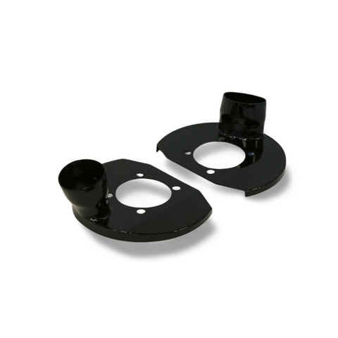 These brake cooling duct plates include 1 left and 1 right steel powder coated brake ducts that mount to the front Spindle hub. Connect your own 2.5" hose and intakes.